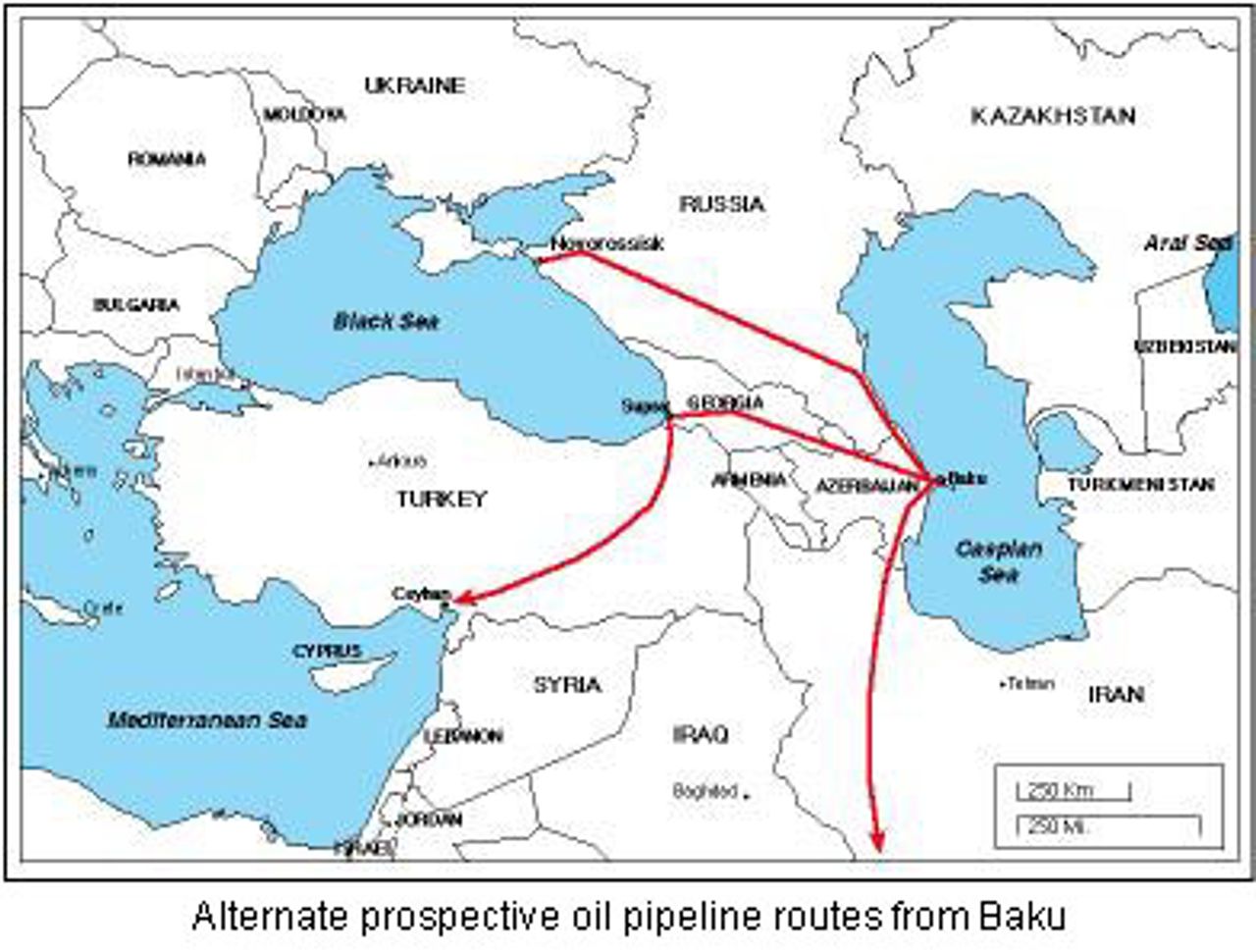 Washington wants the pipeline to pass from Azerbaijan through Georgia to Turkey, emptying out at the Turkish Mediterranean port of Ceyhan. Oil executives have inclined to a more direct, shorter and cheaper route that would flow south through Iran to the Persian Gulf. A third alternative would move the oil from Baku northwest through Russia, ending at the Black Sea port of Novorossisk.