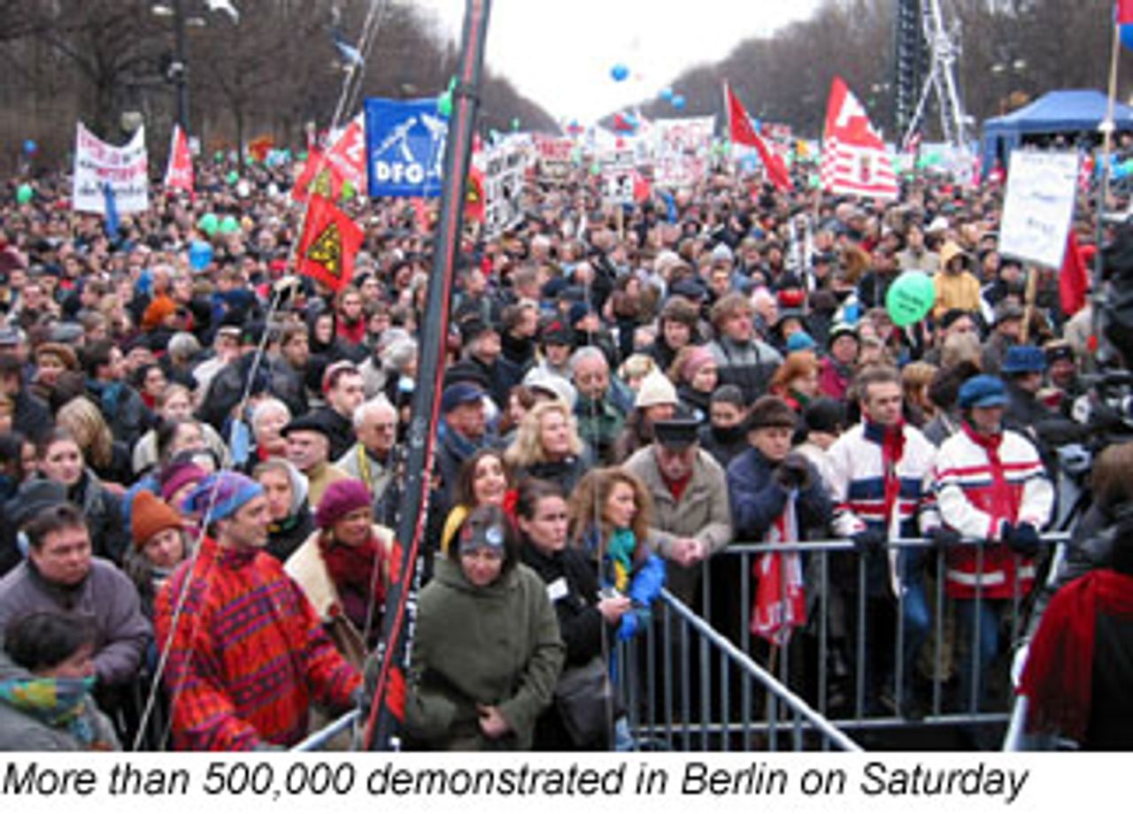 Banners proclaimed one of the main slogans of the march, “No Blood for Oil,” as well as “Old Europe is demonstrating,” a reference to the derogatory remarks on Europe by US Secretary of Defense Donald Rumsfeld. Other banners declared, “No Bush-fire, it will spread like wildfire!” and “Heil Bush.” Many banners made a connection between the struggle against war and the growing social crisis in Germany. One such banner read, “Jobs and education instead of war and arms spending.”