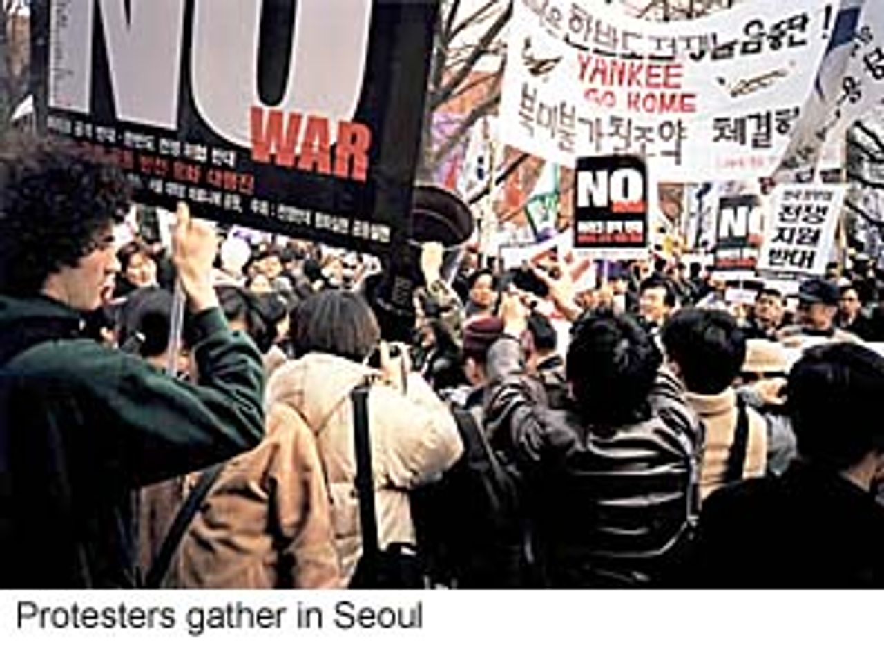 Some 2,000 people assembled in Ma-ron-i-ea Park in downtown Seoul on Saturday afternoon to protest against the planned US invasion of Iraq. After speeches and entertainment, the protesters marched to Jong-Myo Park, a couple of kilometres away. The proceedings were peaceful despite a large police presence throughout the protest.