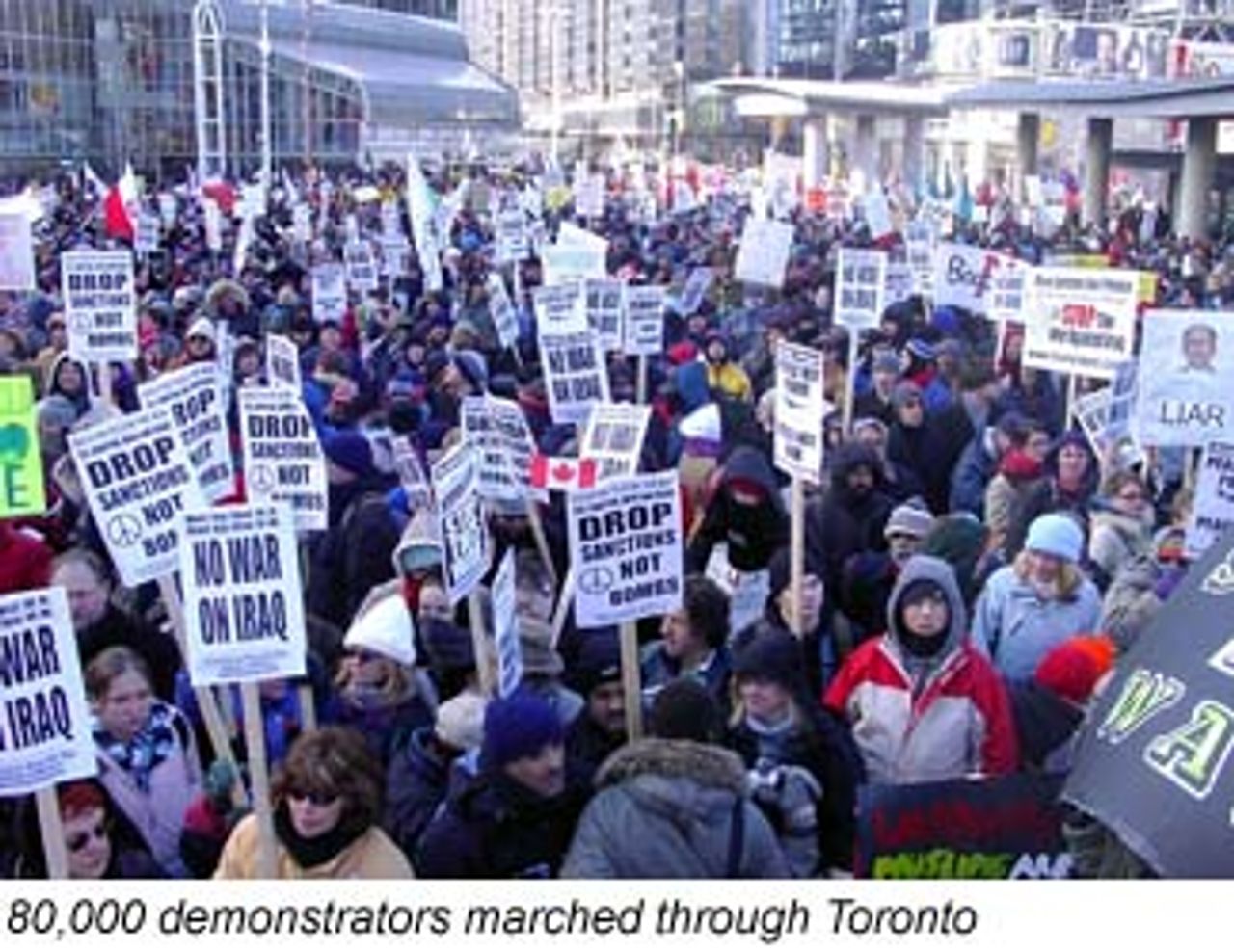 An estimated 80,000 people marched through Toronto Saturday in a colorful and spirited demonstration, despite temperatures of 13 degrees below zero Celsius. Compared to the last antiwar rally on January 18, when about 10,000 participated, this march was not only far larger, but much younger, more working class and diverse.