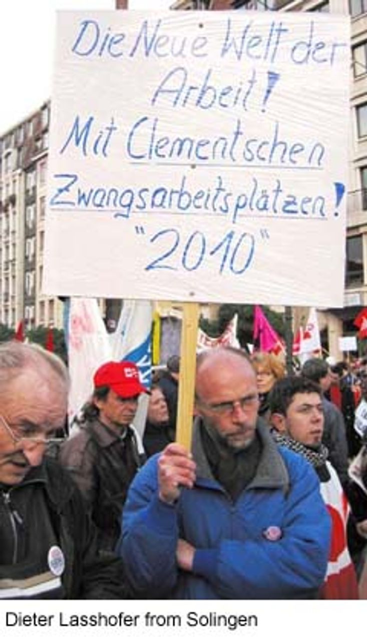 An unemployed forester and attac supporter who came in the same bus carried a placard proclaiming: “The New World According to Clement—Forced Labour.” He explained that the aim of Agenda 2010 was not, as Labour Minister Wolfgang Clement (SPD) claimed, the creation of new jobs, but rather “to establish control over the millions of unemployed by forcing them to undertake forms of forced labour.” He added: “The SPD is seeking to reintroduce conditions which existed in the 19th century. Agenda 2010 is only a beginning, a pilot project in this direction.”