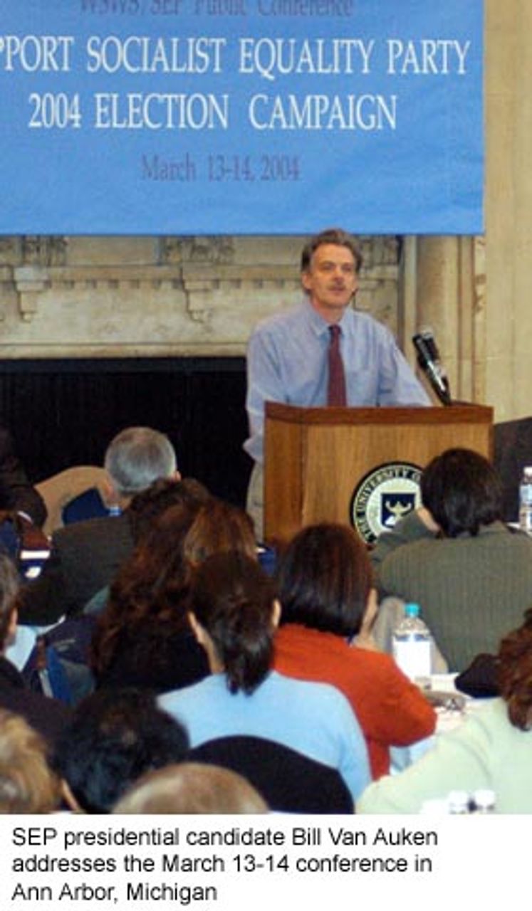 On March 13-14, the World Socialist Web Site and the Socialist Equality Party held a highly successful conference entitled“The 2004 US Election: the Case for a Socialist Alternative.” The event, held on the campus of the University of Michigan in Ann Arbor, was attended by 135 delegates, including students, workers, professional people and retirees from across the United States. Delegates traveled from California, the Pacific Northwest, the South, the East Coast and a number of midwestern states to participate in the conference. Also in attendance were delegations from Australia, Germany, Britain and Canada.
