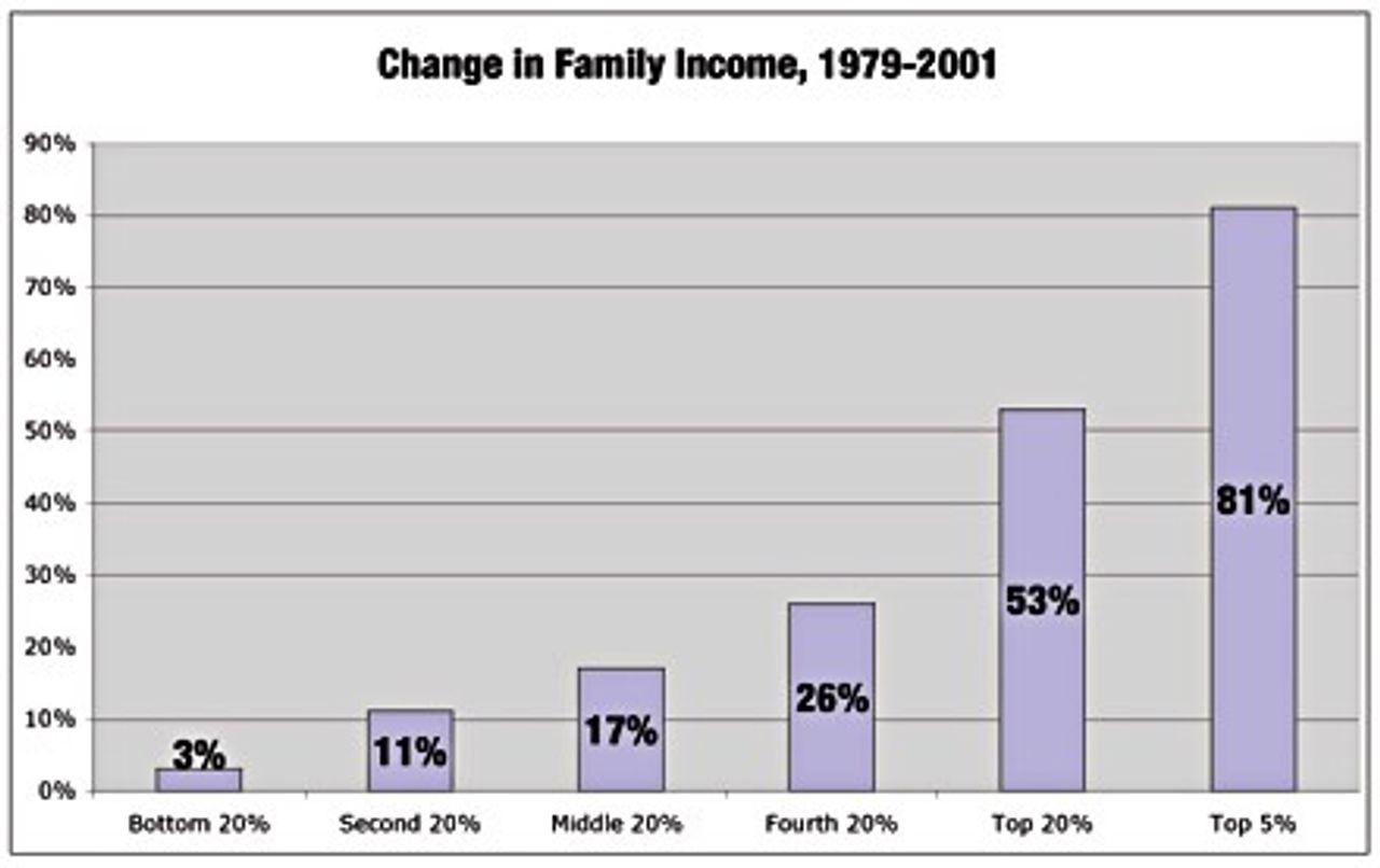 Now let us look at Chart 2, which tracks changes in family income between 1979 and 2001. What an extraordinary difference! We see that the bottom 80 percent of families realized very limited gains, while the wealthiest sections of the population, and especially the top 5 percent, continued to realize a substantial growth in family income. The bottom 20 percent of families realized only a 3 percent gain. The second 20 percent realized an 11 percent gain. The middle 20 percent realized a 17 percent gain, and the fourth 20 percent realized a 26 percent gain. But the top 20 percent saw its income rise by 53 percent, and, from within that group, family income of the top 5 percent rose by 81 percent.