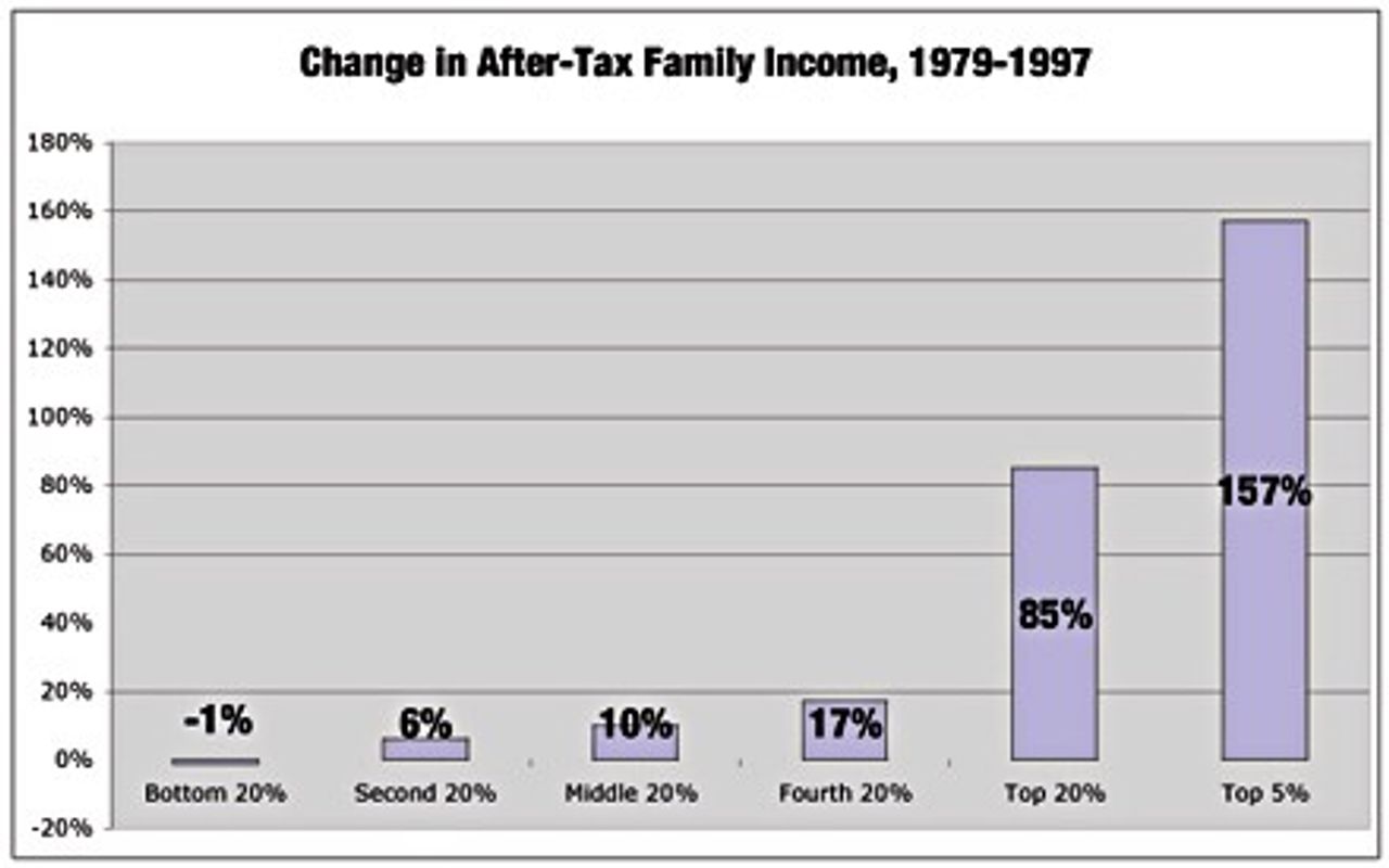 If we look at Chart 3, which tracks changes in family income after taxes, the inequality in family income is even more striking. Between 1979 and 1997, the bottom 20 percent saw a 1 percent decline in its family income. The top 5 percent saw a 157 percent increase!