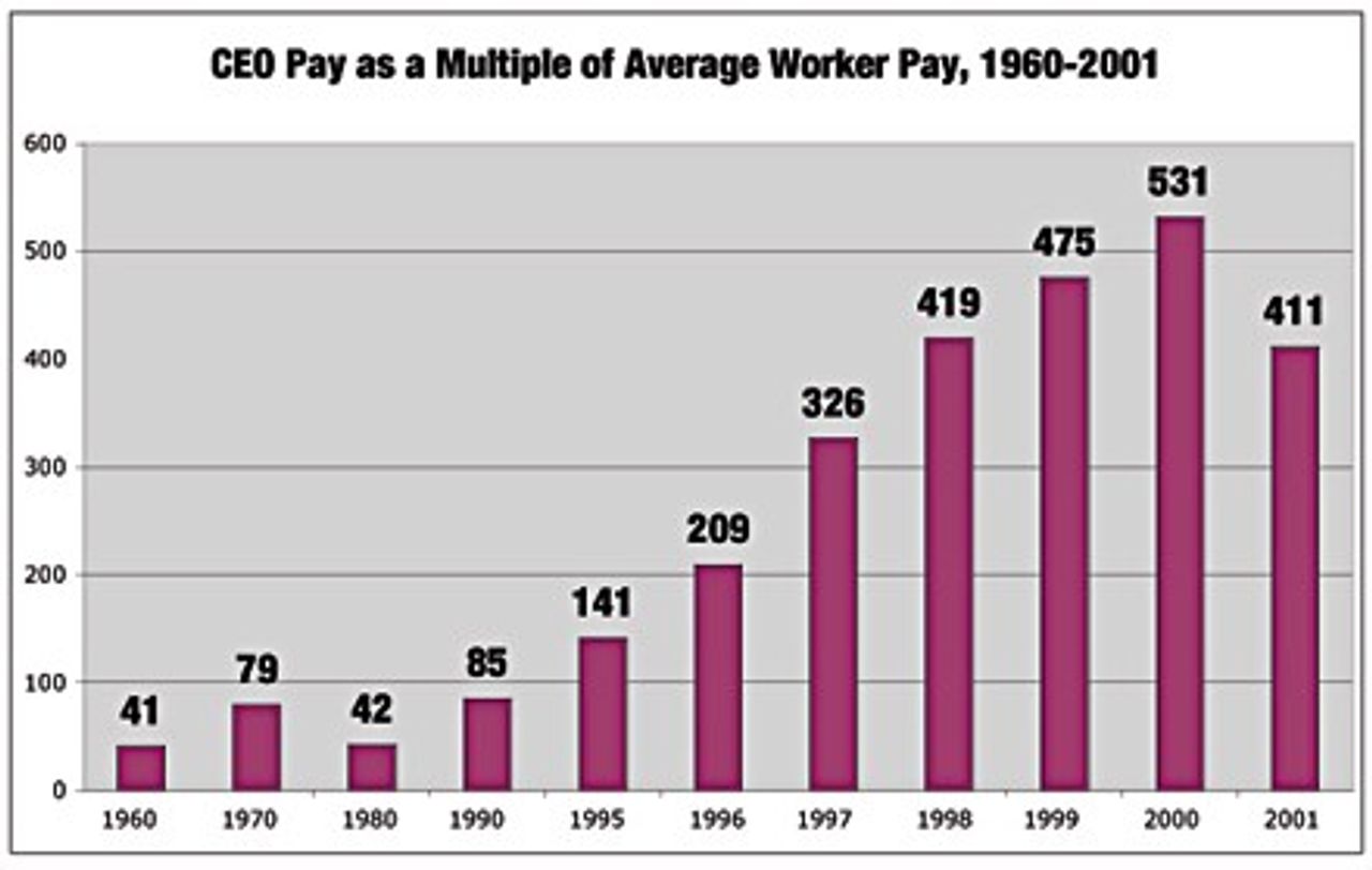 Now let us look at Chart 4, which shows CEO pay as a multiple of average worker pay between 1960 and 2001. In 1960, CEO pay at an average Fortune 100 company was 41 times that of an average factory worker. In 1970, due to a substantial rise in the stock market, that multiple had risen to 79. The 1970s, a decade of extreme economic crisis which witnessed a massive decline in share values, saw the multiple fall back to 42. Then look at what happened. By 1990, CEO pay had risen to 85 times the pay of an average worker. By 1996 it was at 209 times. By 2000 it had risen to 531 times!
