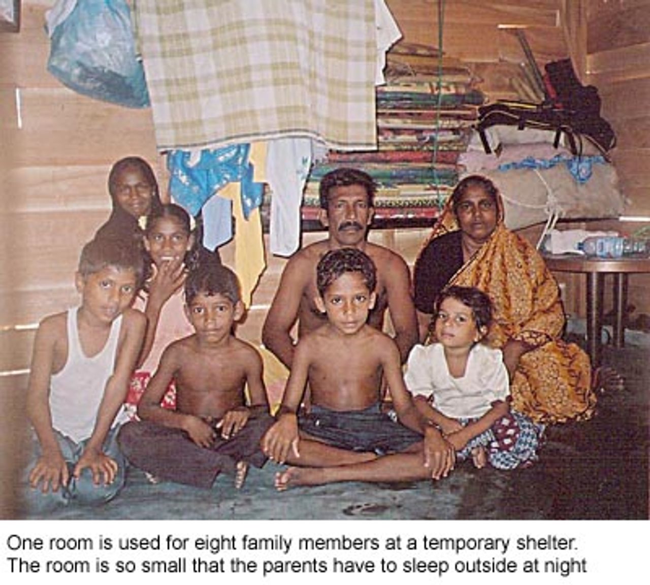 Almost all emergency refugee camps have now been closed—only five remain housing 3,450 people. Most of the tsunami victims—37,321—have been moved to 100 temporary shelters. But the change of name and location has not resulted in any significant improvement in living conditions. Many of the refugees are caught in a bind. The government has arbitrarily banned rebuilding of homes within 200 metres of the sea—where they used to live. At the same time, official relocation and reconstruction programs have not even begun.