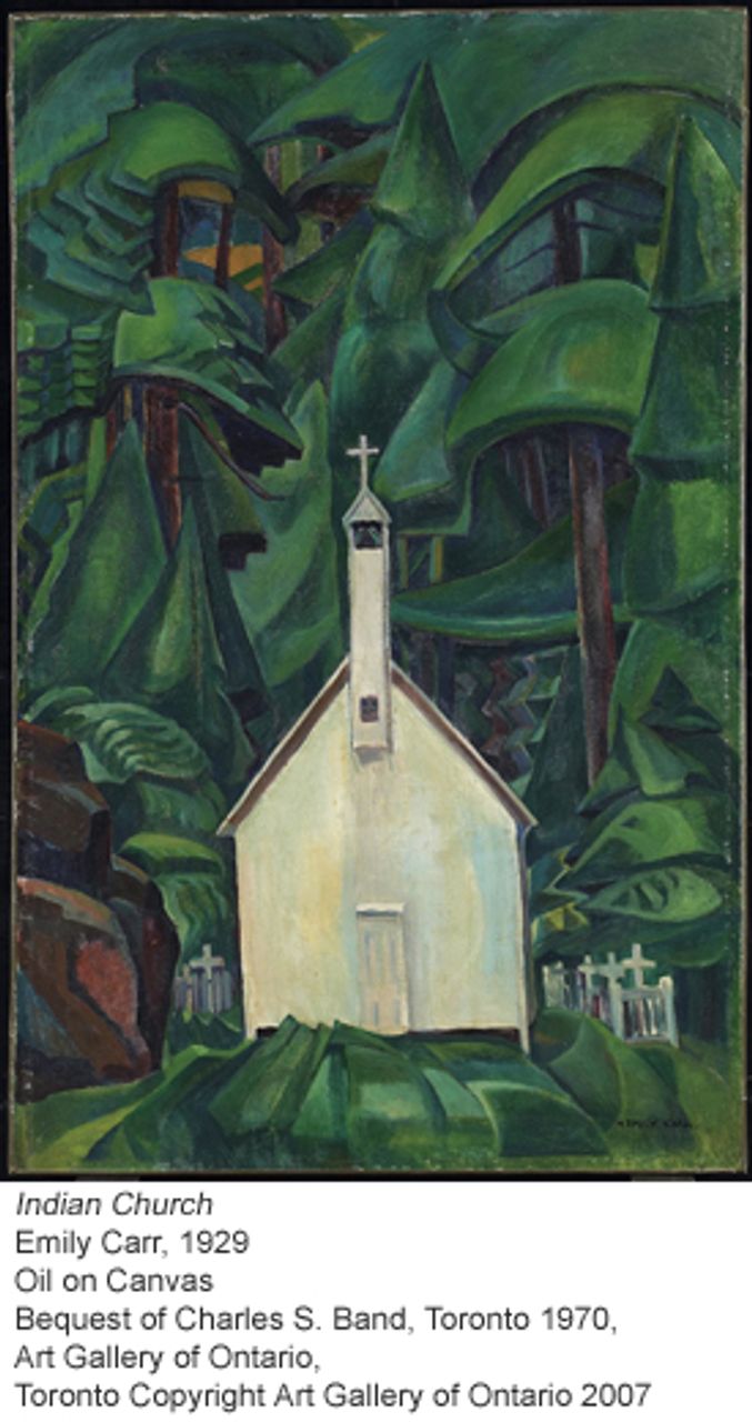 “Guyasdoms D’Sonoqua” is a painting that combines a kind of primitivism with a distinctly cubist simplification of form, as does the more well-known “Indian Church.” In the latter work, surrounded by ominous green shapes, a starkly pale Christian church is placed, more in two dimensions than three, as an intruder in a feral forest—emphasizing starkly the conflicting worlds brought together here. She was not fond of organized religion in general, while still being drawn to a personal faith, but this painting leaves her feelings about this juxtaposition open to interpretation.