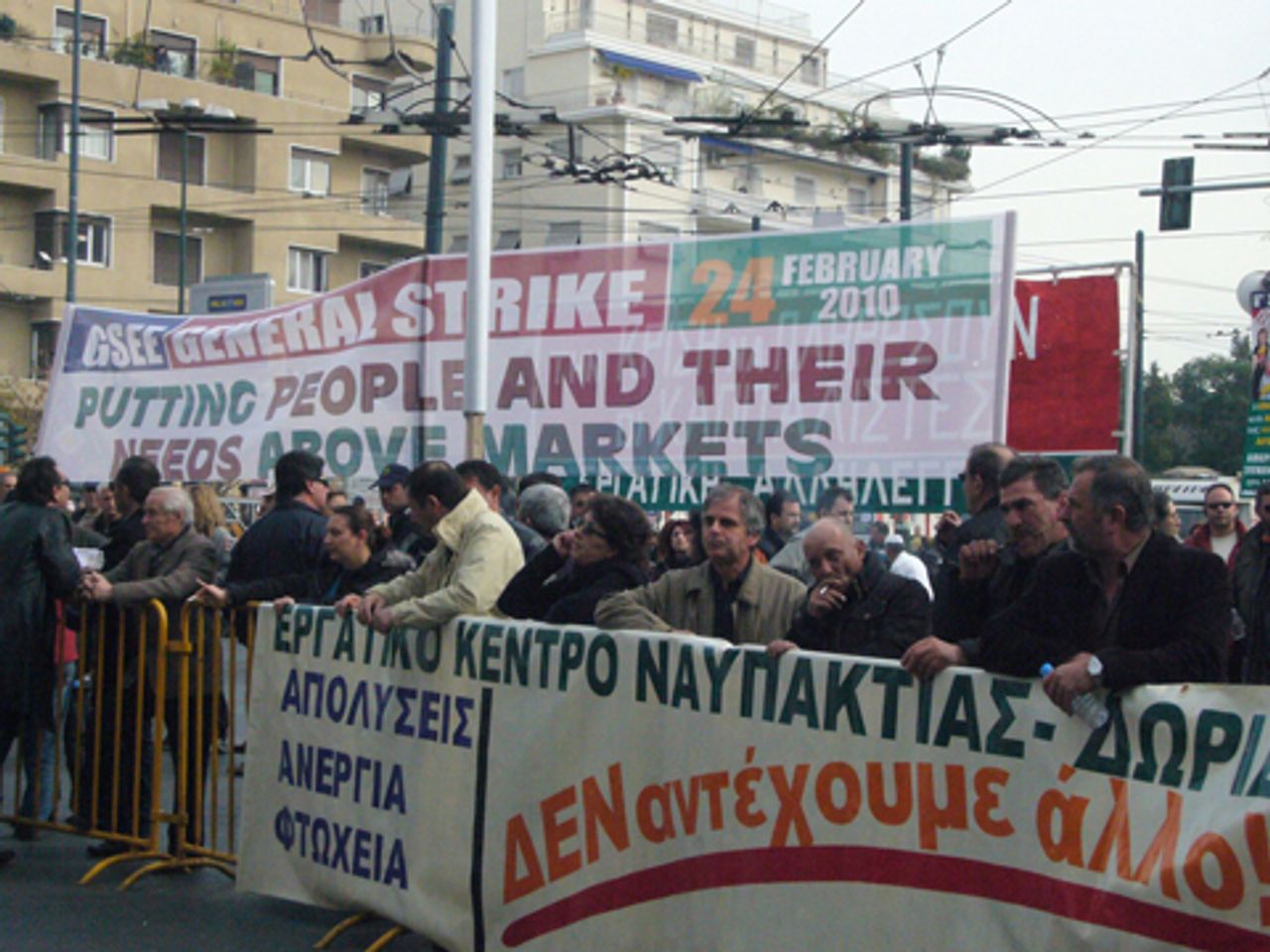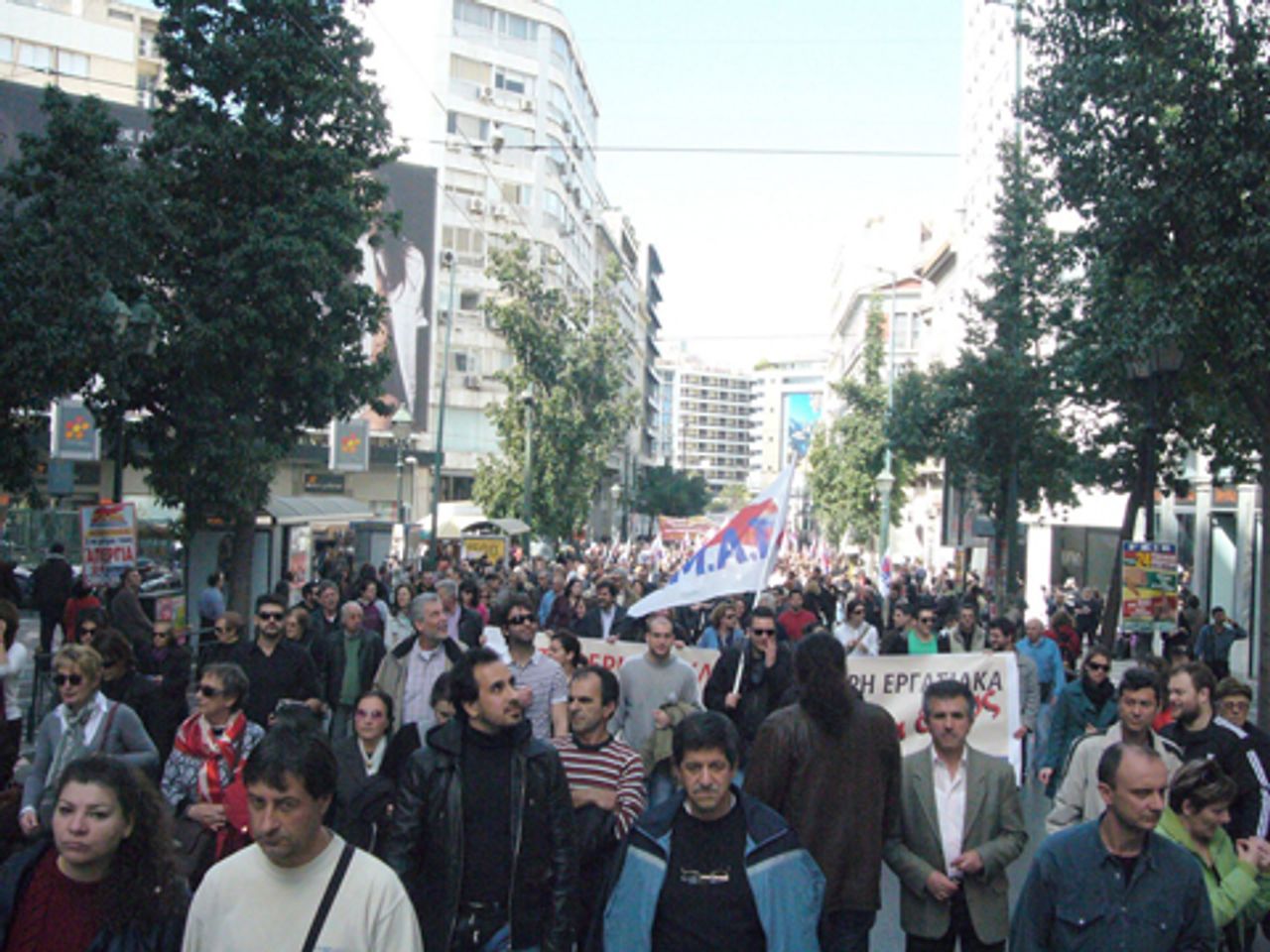 Yesterday’s action was the first general strike since the landslide election of the PASOK government. It was called by the two main trade union federations, covering the private and public sectors respectively—the General Confederation of Greek Workers (GSEE) and the Civil Servants’ Confederation (ADEDY). Together, the two federations represent about half of the five million-strong Greek work force.