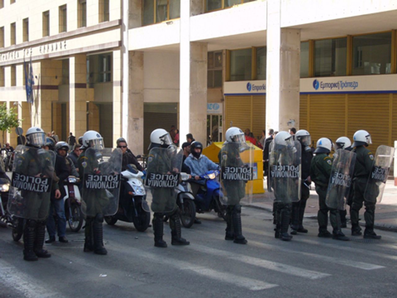 Riot police during the marchA section of protesters was attacked by riot police with pepper spray and tear gas near Syntagma Square. The police claimed this was to prevent some of the protesters from entering Athens University. Police brutally beat some of the demonstrators with their truncheons and made several arrests.