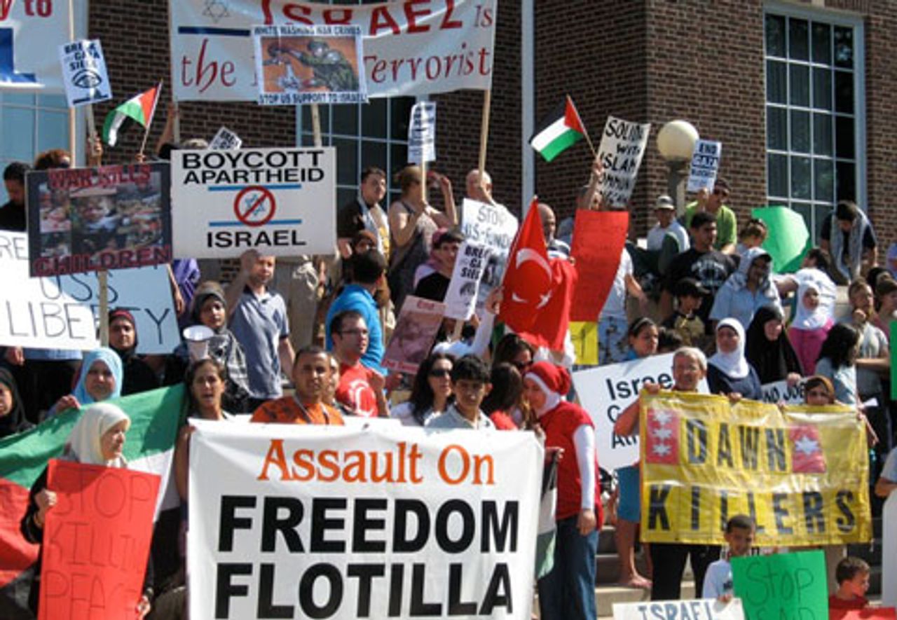 The demonstration at Dearborn City HallIn New York City, hundreds of protesters assembled in Times Square Monday, before marching to the Israeli consulate. They carried signs saying “Free Gaza,” and “Israeli soldiers shot unarmed civilians.” Three thousand people were reported in attendance in Los Angeles demonstrating outside the Israeli embassy.