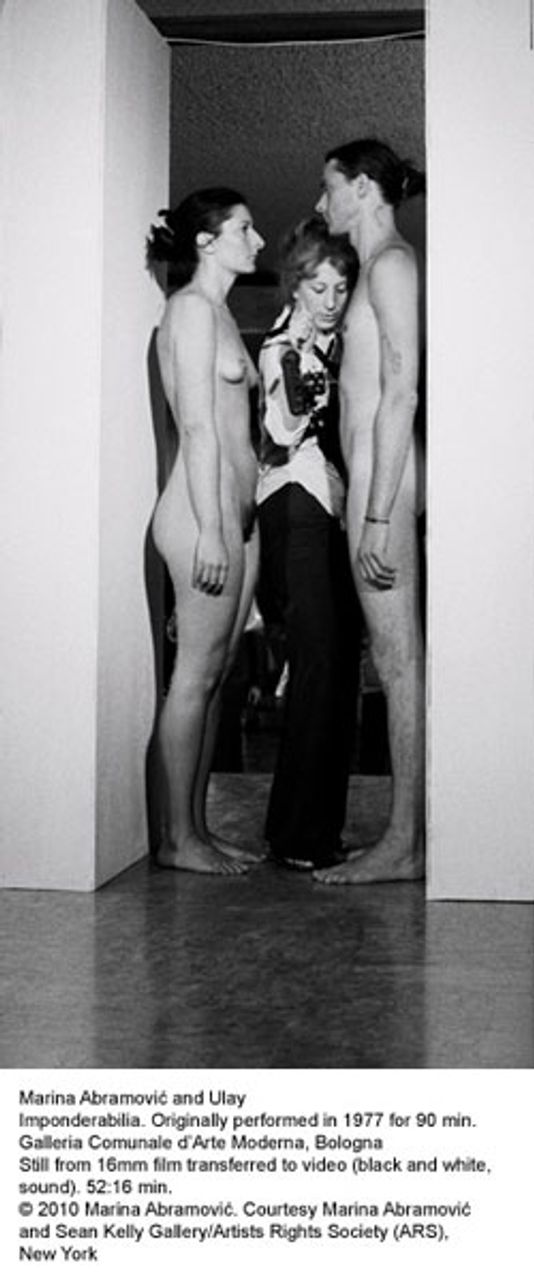 Abramovic and Ulay met in Amsterdam in 1976 and formed an intense personal and professional collaboration. Much of the strength of their work resides in the physical magnetism of the pair—Abramovic at 64 remains strikingly beautiful—and their ability to withstand pain (and probably boredom) without flinching.