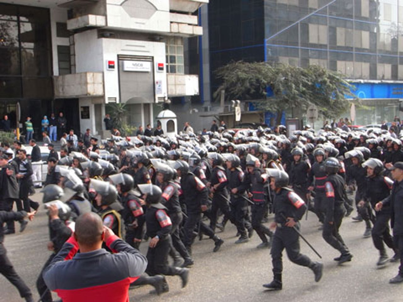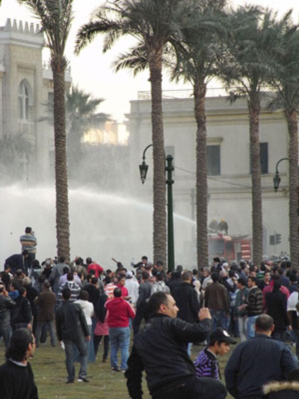 Marchers demonstrated in front of the ruling National Democratic Party headquarters in Cairo chanting, “We want a free government” and “Down with Mubarak.” Later, crowds advanced to Tahrir Square and attempted to storm the Egyptian parliament. They were met by waves of police and security forces who used water cannon, tear gas and clubs to repulse them.