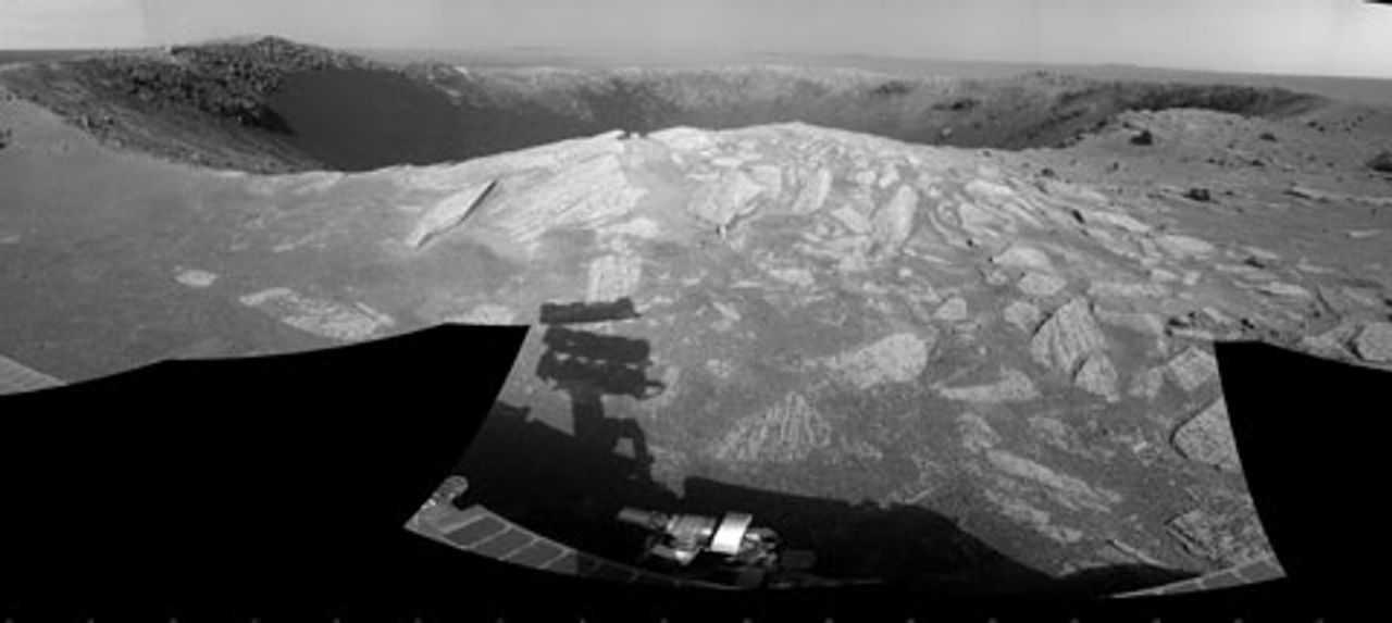 The Santa Maria crater on Mars [Courtesy NASA]Opportunity continues its explorations virtually unimpeded by the severe conditions that prevail on the surface of Mars. By the middle of this month, it had reached the southeastern edge of a crater named Santa Maria, which has a diameter of about 100 meters.