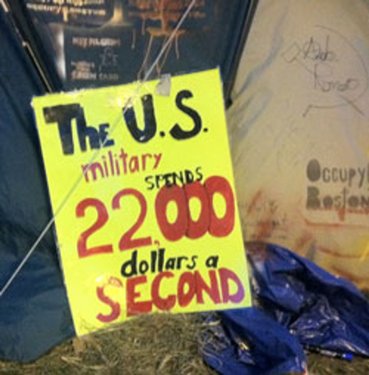 A sign at the Boston protestWith Occupy Boston nearly a month old, protesters are maintaining their encampment of about 150 tents in the city’s financial district. The protest was the target of a raid on October 12, when Boston police in riot gear cleared protesters out of an area adjacent to the original location where protesters had set up camp. A number of the 147 people arrested in the early morning raid still face charges.