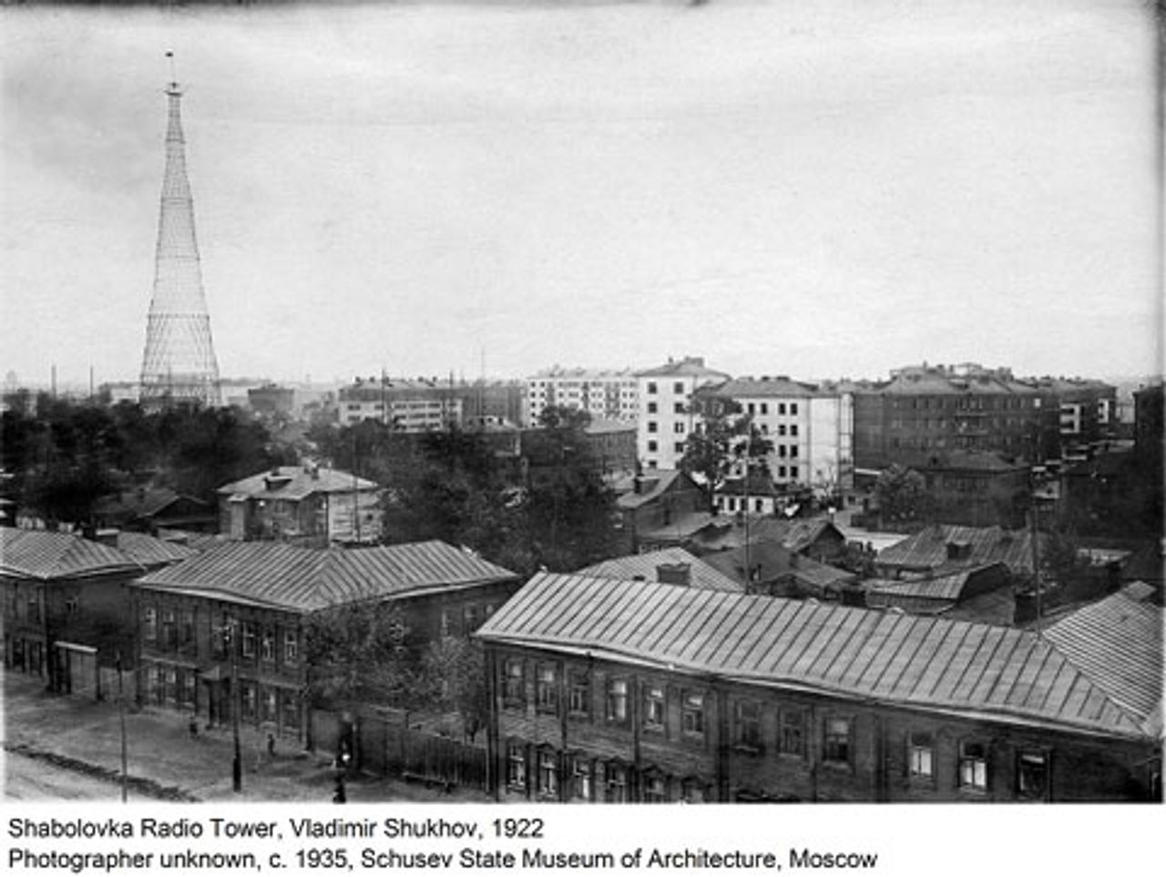 After the revolution, it was a few years before the exhausted economy began to expand again through the New Economic Policy and made available sufficient resources for construction projects. One of the first was Vladimir Shukhov’s Shabolovka Radio Tower completed in 1922, although it ended up under half its planned 350 metres due to a scarcity of steel.