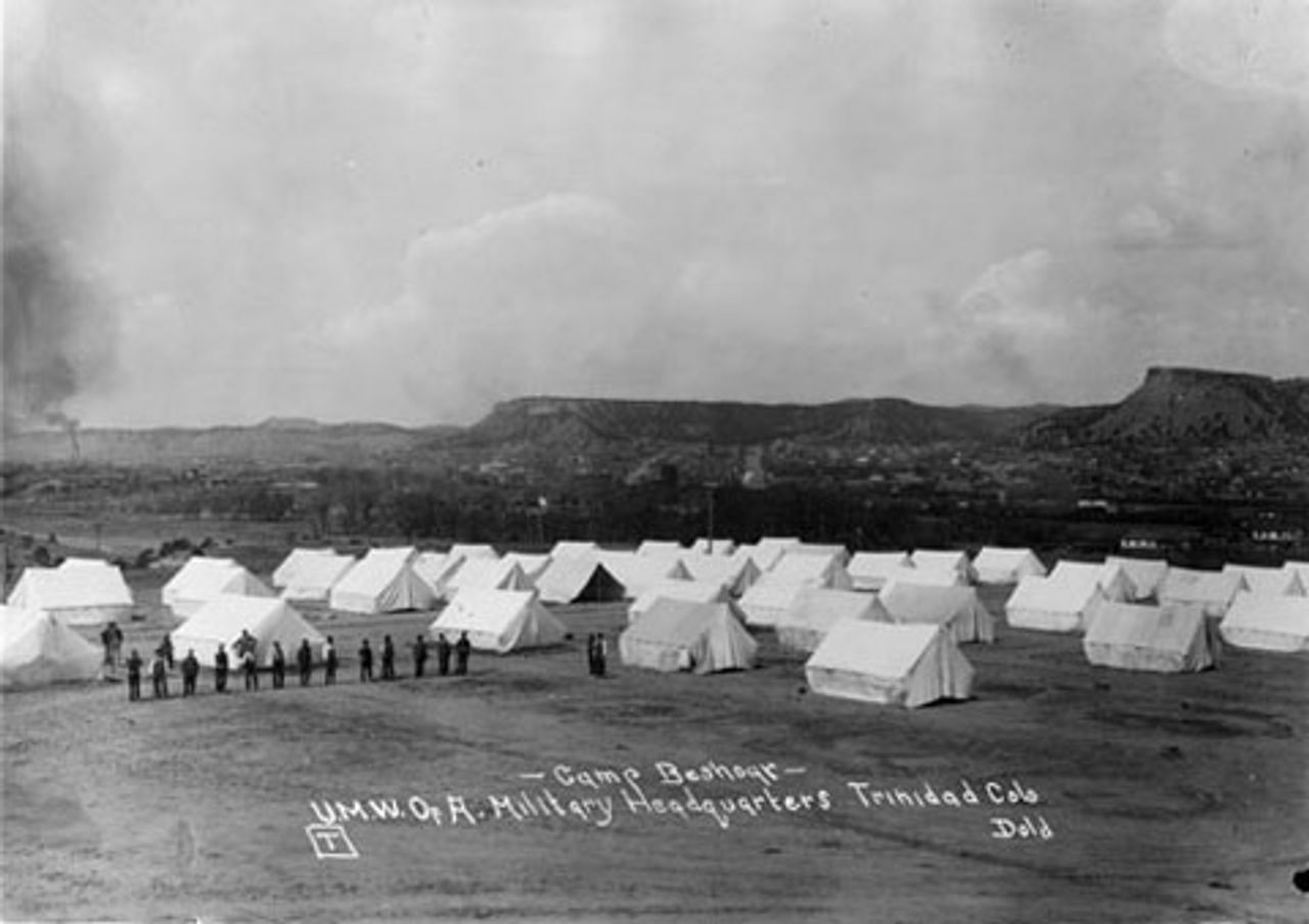 The strike began on September 23,1913. CFI promptly evicted from company towns all striking miners, who were forced to set up tent cities using resources provided by the UMW. Soon 12,000 miners, or 85 percent of all coal workers in Colorado, were on strike. Strikers wore red bandanas around their necks and referred to them as “badges of courage.” Production was shut down almost entirely.