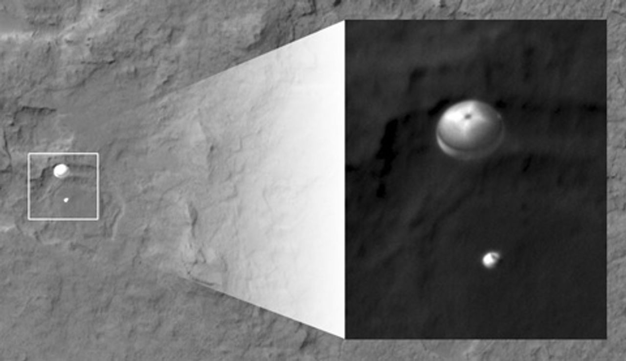 The Mars Express recorded Doppler information on the landing craft, tracking it as it traveled down to Mars. Finally, the Mars Reconnaissance Orbiter used the extremely powerful HiRISE camera for mapping the landing site. It also captured a picture of Curiosity during the deployment of the parachute.