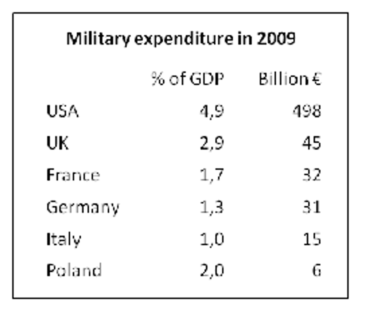 මිලිටරි කාරනා වලදී බි්රතාන්ය හා ප්රන්සය තවමත් ප්රමුඛත්වය දරයි. ජර්මනිය මිලිටරි පිරිවැය සඳහා යොදවන්නේ දල දේශීය නිෂ්පාදිතයෙන් සියයට 1.3ක් පමනි. ප්රන්සය හා බි්රතාන්ය සියයට 1.6ක් හා 2.8ක් වැය කරති. ඒ අනුව දෙරටේ ඒකාබද්ධ පිරිවැය ජර්මනිය මෙන් තුන් ගුනයකටත් වැඩිය. කෙසේ වෙතත් ඒ දෙරටම එක්සත් ජනපදය හමුවේ අඟුටු මිට්ටන් බවට පත් වෙයි. එරට මිලිටරි පිරිවැය වෙනුවෙන් දදේනි සියයට 5ක් පමන වැය කරයි.