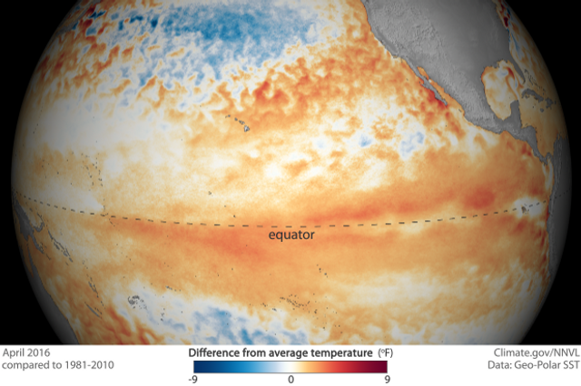 නාසා ආයතනය රැස්කල දත්ත වලට අනුව, 2016 මුල් මාස සදහා නව උෂ්නත්ව වාර්තා සකස් කර ඇත. එක් පරියේෂකයෙකු “අසාමාන්ය” උෂ්නත්වය ලෙස සඳහන් කල දේ පිටුපස ඇති ගාමකය, අසාමාන්ය පරිදි දිගු කාලයක් පවතින එල් නිනෝ සංසිද්ධියයි. ඒ අතරම පසුගිය වසර කිහිපයේ කරන ලද පරියේෂන පෙන්නුම්කර ඇත්තේ, එල් නිනෝ හා එහි සිසිල්-ජල සහචරයා වන ලා නිනා සංසිද්ධිය, අහිතකර මානව කටයුතු නිසා උග්ර කල දේශගුනික විපර්යාස මගින් වඩාත් ආන්තික තත්වයට පත්කර ඇති ආකාරයයි.