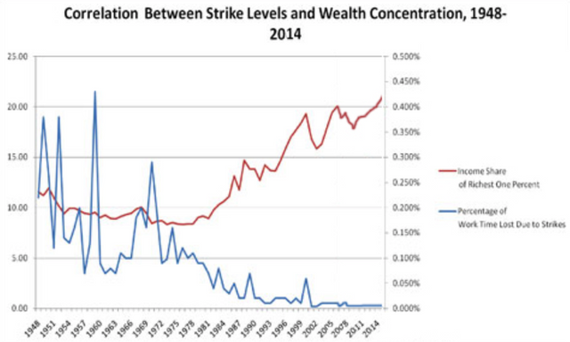 දෙවැනි ලෝක යුද්ධයෙන් පසු ඔබාමා පාලනාධිකාරය යටතේ වැඩවර්ජන එහි පහල ම මට්ටමට ගෙන ආ, වෘත්තීය සමිති විසින් පන්ති අරගලය කෘතිම ලෙස මර්දනය කිරීම, 2008 මූල්ය අර්බුදයෙන් පසුව, තම මෙහෙයුම් ප්රතිව්යහගත කිරීමට හා ශ්රම පිරිවැය කපා හැරීමට සංගතවලට ඉඩ සලසාදී ඇත. වෛද්ය හා විශ්රාම වැටුප් වියදම් කම්කරුවන්ගේ කර මතට පාත් කිරීමට හා මිලියන ගනනාවක් කම්කරුවන් අනියම් කම්කරුවන්ගේ තත්වයට පරිවර්තනය කිරීමට මෙය උදව් වී ඇත.