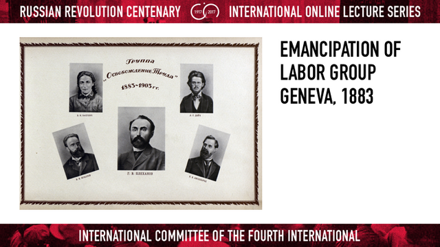 ප්රථම රුසියානු මාක්ස්වාදී කන්ඩායම පිහිටුවන ලද්දේ 1883 දී ජිනීවා නුවරදීය. එයට ජෝර්ජි ප්ලෙඛානොව් (පින්තූරයේ මැද) ප්රමුඛ, පිටුවහලේ සිටි විප්ලවවාදීන් හය දෙනෙක් සම්බන්ධ වූහ. ප්ලෙඛානොව් ප්රමුඛ කෘතීන් පරිවර්තන කරමින් ද මාක්ස් ගේ මතවාද ජනප්රිය කරන ග්රන්ථ සම්පාදනය කරමින් ද 1889 යුරෝපයේදී පිහිටුවන ලද දෙවන ජාත්යන්තරයට සහභාගී වෙමින් ද වැදගත් ප්රතිපදානයක් කලේ ය. එම අවුරුද්දේ දී ඔහු පහත සඳහන් සුප්රසිද්ධ ප්රකාශය කලා. “රුසියාවේ විප්ලවවාදී ව්යාපාරය ජයගනු ඇත්තේ කම්කරු ව්යාපාරයක් ලෙසය. නැතහොත් එය කිසිසේත්ම ජයගනු නැත.” යෝධ ගොවි ජනතාවක් මැද්දේ සංඛ්යාවෙන් අඟුටුමිටි වූ කම්කරු පන්තියක් ගැන මෙවන් ප්රකාශයක් කිරීම ඔහුගේ විවේචකයන් බොහෝ දෙනෙකු විසින් දැකගන්නා ලද්දේ විකාරයක් ලෙසය.