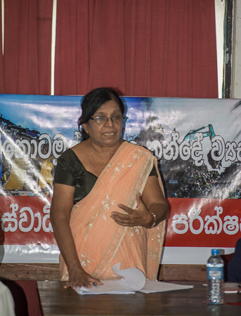 “මීතොටමුල්ල නිවැසියන් තේරුම්ගෙන ඇති පරිදි ධනපති ආන්ඩු සූදානම් වන්නේ කොලඹ අතුලු ඒ අවට ප්රධාන නගරවල අඩු ආදායම්ලාභීන් නිවාස වලින් ඉවත්කර ආයෝජකයන්ට එම ඉඩම් පවරාදීමටයි.” යයි චෝදනා කල ඇය දැනටමත් කොම්පඤ්ඤ වීදියේ නිවාස සියගනනක් ඉවත්කර අක්කර 7ක් ඉන්දියානු ටාටා හා තවත් අක්කර 3ක් පකිස්තානයේ ඉම්පීරියල් යන සමාගම්වලට පවරා අතිබව ඇය පෙන්වා දුන්නාය.