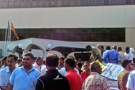 ගුවන් සේවා සමාගමේ ඉහල ලාභ පෙන්නුම් කල කම්කරුවෝ “බිලියන ගනන් උපයනවා අපට හුලං” යයි සටන් පාඨ කියා හඬ නැගූහ. වසර 25 ක් ගුවන් තොටුපලේ සේවයේ නිරත ගුවන් තොටුපල ගිනිනිවීම් රථ අසල සිටි එක් කම්කරුවෙක් ලෝක සමාජවාදී වෙබ් අඩවියට (ලෝසවෙඅ) මෙසේ ප්රකාශ කලේ ය: “අපිට රජයේ වැටුප් වැඩිවීම් මොකුත් ලැබෙන්නේ නෑ. අවුරුදු තුනෙන් තුනට වැටුප් වැඩිවීමට තමා ගිවිසුම අත්සන් කරලා තියෙන්නේ. 2014 ට අපිට වැටුප් වැඩි වෙලා නෑ. අනෙකුත් අනුබද්ධ ආයතනවලට වරායට, පෙට්රෝලියම් හා පාඩු ලබනවා යයි කියන ශ්රී ලංකන් එකටත් වැටුප් වැඩිවීම් දුන්නා. නමුත් අපිට නෑ. අපි ඊයෙත් පිකටින් කලා. මාධ්ය හැම එකක වගේ ප්රචාරය කලා. ඒක ඇමතිලා දන්නෙත් නැතිලු. පාර්ලිමේන්තුවේ ඉන්න උන් දන්නේ නැතිලු. ඉස්සරහ පොලිසිය ගාව නවත්වලා තියෙනවා පොලිස් කැරලි මර්දන ඒකක මෙහෙට එන්නේ නෑ බයයි. අපිට ගැහුවොත් අපිත් ගහනවා.”