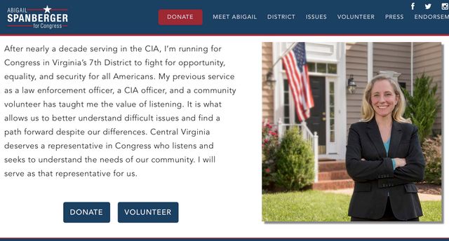 වර්ජිනියාවේ රිච්මන්ඞ්හි උප නගර වල එක දිස්ත්රික්කයක ඩිමොක්රටික් පාක්ෂික නාමයෝජනා ඉල්ලා සිටින අබිගෙල් ස්පන්බර්ගර් සිය වෙබ් අඩවියේ මුලට මෙසේ ප්රකාශ කරයි: “සීඅයිඒ සංවිධානයේ අවුරුදු දහයක් වැඩ කිරීමෙන් පසුව මම, ඇමරිකානුවන් සඳහා අවස්ථාව, සමානත්වය සහ ආරක්ෂාව උදෙසා සටන් කිරීමට වර්ජිනියාවේ 7වන දිස්ත්රික්කයෙන් කොන්ග්රසය සඳහා තරග වදිමි. නීතිය ක්රියාත්මක කිරීමේ නිලධාරියෙකු, සීඅයි ඒ නිලධාරියෙකු සහ ස්වේච්ඡා ප්රජා සේවකයෙකු හැටියට මා කලින් ඉටු කර තිබෙන සේවාව ඇහුම්කන් දීමේ වටිනාකම මට උගන්වා තිබේ.” ඇත්තට ම !