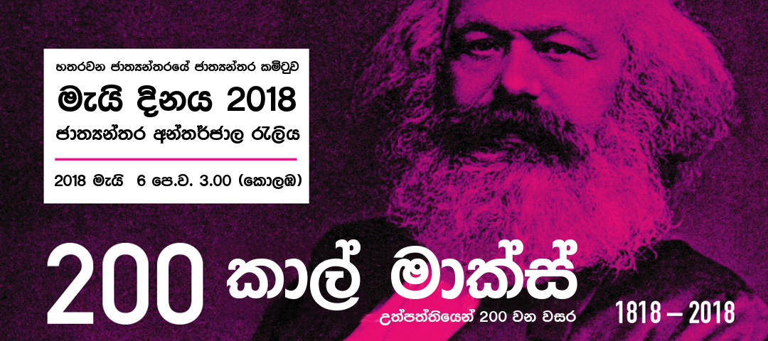 මාක්ස්ගේ උපතින් දෙසිය වන සංවත්සරය යෙදෙන මෙම මැයි 6 වන ඉරිදා ශ්රී ලංකා වේලාවෙන් පෙ.ව. 3.00 ට හජාජාකය සිය වාර්ෂික ජාත්යන්තර මැයි දින රැලිය අන්තර් ජාලය ඔස්සේ පවත්වයි. එය wsws.org/mayday ඔස්සේ ලොව පුරා විකාශනය කෙරේ. අපේ සියලු පාඨකයන්ට ද, ලොව පුරා සියලු කම්කරුවන්ට ද මෙම 2018 මැයි දිනයට ලියාපදිංචි වන ලෙසත්, ඊට සහභාගී වන ලෙසත් අපි තරයේ ඉල්ලා සිටිමු.