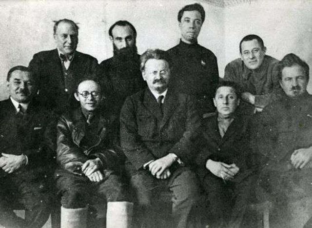 පිටුවාහලේ සිටි වාම විපාක්ෂිකයෝ. උඩ වමේ: වික්ටර් බොරිසොවිච් එල්ස්ටින්, මැද දකුනේ: ඉගෝර් එම්. පොස්නන්ස්කි. දෙදෙනාම ලියොන් ට්රොට්ස්කිගේ සමීප සහකරුවෝ වූහ.