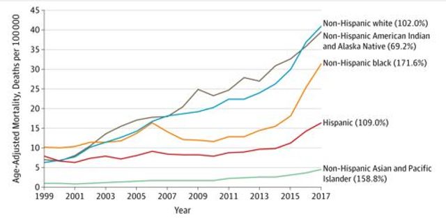 මරන අනුපාතය ඉහල යාම සෑම වාර්ගික හා ජනවාර්ගික කණ්ඩයකම කම්කරුවන්ට බලපා ඇති අතර, සුදු ජාතික කම්කරුවන් අතර වැඩිම අතිරික්ත මරන සංඛ්යාව සිදුවී ඇත. එය “සුදු වරප්රසාදය” යන සංකල්පය දැඩි ලෙස ප්රතික්ෂේප කිරීමකි. එවැනි වාර්ගික සංකල්ප මගින් පාලක පන්තිය වාර්ගික හා ජාතික බෙදීම් ප්රවර්ධනය කිරීමට උත්සාහ කරන්නේ, සමාජ ජීවිතයේ යථාර්ථය සියලු වාර්ගික හා ජාතිකත්වයන්හි කම්කරුවන්ගේ අවශ්යතාවන්ගේ මූලික අනන්යතාවය (ඒකීයත්වය) සනාථ කරන අතරම වෙ.