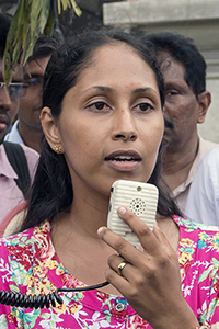 යනූෂා ලක්මාලිරැස්වීමට සහභාගි වූ යනූෂා ලක්මාලි මෙසේ සඳහන් කලා ය: “අදට මගේ මහත්තයා සිරගත කර දවස් 78ක් ගත වී තිබෙනවා. ලේඛිකාවක් විදිහටත්, රජයේ රැකියාවක් කරන තැනැත්තියක් විදිහටත් මා පසුවන්නේ දැඩි කම්පනයකින්. එයට හේතුව කලා නිර්මානයක් කල තැනැත්තෙක් ත්රස්තවාදී චෝදනා යටතේ සිරගත කරන්නේ කෙසේ ද කියා මට ප්රශ්නයක් තිබීම යි. මා රැකියාවට යන්නෙත් අසීරුවෙන්. අනෙක් හැමෝ ම මා දෙස බලන්නේ දැඩි වරදක් කල තැනැත්තියක් ලෙසට යි. ඒත් අද දින මෙතැනට විශාල පිරිසක් රැස්ව සිටීමෙන් මා, මගේ දරු දෙදෙනා හා මහත්තයා තනි වී නැතැයි මට හැඟෙනවා.”
